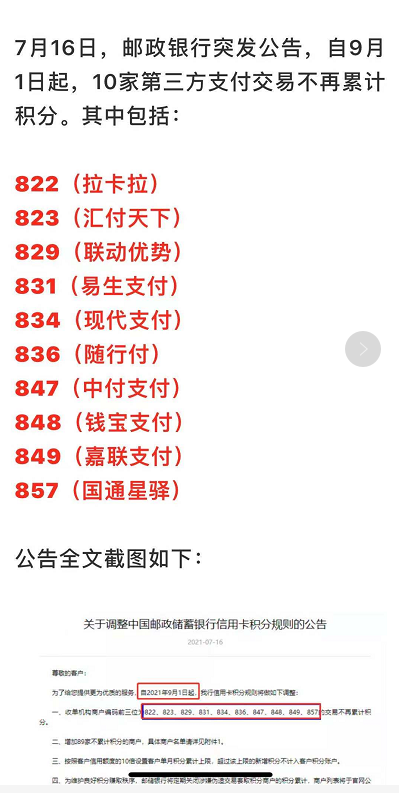 近日, 邮政银行发出9月1日新积分奖励规则, 其中把部分支付公司代码拉入无积分行列。